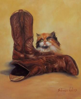 Malanleitung – Mieze mit Stiefeln von Kathwren Jenkins: “Vor vielen Jahren gaben mein Ehemann Gary und ich Kurse in einer Kleinstadt. Eines Tages kamen wir an einem Schusterladen vorbei. Im Schaufenster sah ich dieses Paar alter Stiefel. Also ging ich hinein und fragte, ob sie zu verkaufen seien. Ich erwarb also diese Stiefel und später wurden Sie Grundlage für die Komposition dieses Bildes.”